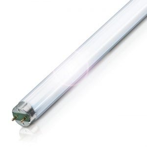 Люминесцентные лампы T8 d26mm с цоколем G13 светятся за счет прохождения электрического разряда по колбе, наполненной инертным газом и парами ртути. Такой источник света чаще всего используется в школах, офисах, больницах и других общественных объектах. Встречаются модели и для установки на светильники в жилых помещениях.